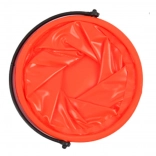 Der orangefarbene Falt-Eimer kann leicht zu einer flachen Form zusammengelegt werden, was das Lagern und Transportieren erleichtert.