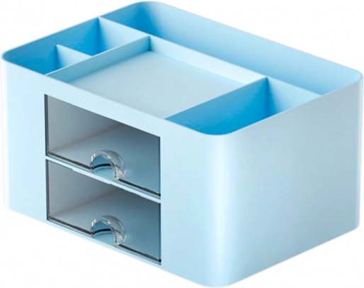 Der blaue Organizer bietet 5 Fächer und 2 Schubladen für verschiedene Organisationsbedürfnisse.