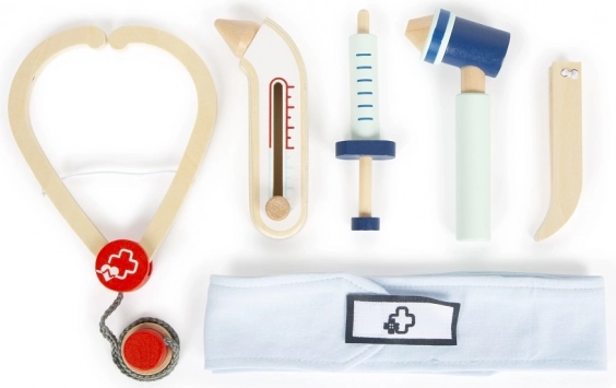 Das komplette 6-teilige Set umfasst Stethoskop, Spritze, Thermometer, Otoskop, Pinzette und Verband – alles angepasst an Kinderhände und sicheres Spielen.