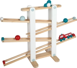 Die spannende Abfahrt von Kugeln und Auto über vier stabile Bahnen hält Kinder in Atem und fördert Konzentration, Reaktionsvermögen und Hand-Auge-Koordination.