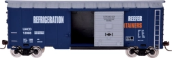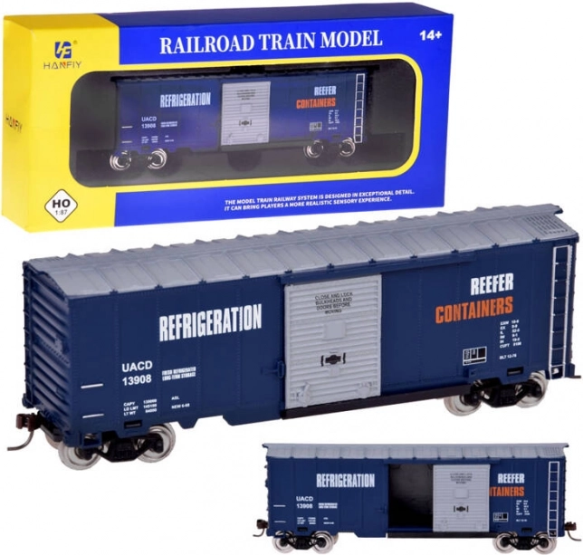 Dieser Kühlgüterwagen für Modelleisenbahnen im Maßstab H0 1:87 bietet das authentische Erscheinungsbild echter „Reefer“-Containerwagen. Die blau-graue Ausführung mit markantem Aufdruck REFRIGERATION und REEFER CONTAINERS sowie funktionierenden Schiebetüren unterstreicht das realistische Erlebnis auf der Strecke.