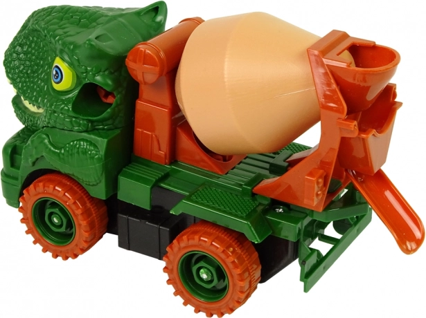 Ein Dinosaurierkopf mit markanten Zügen und eine rotierende Mischtrommel unterstützen kreative Bauszenen und fantasievolles Spiel.
