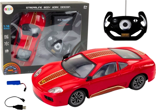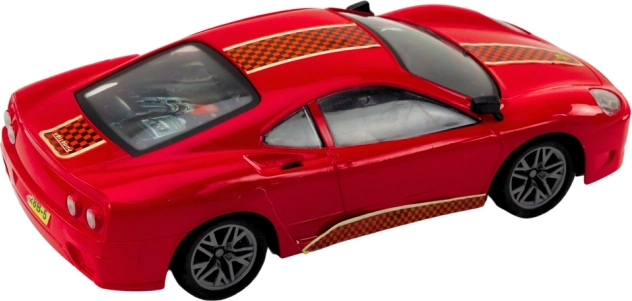 Rotes ferngesteuertes Auto mit schwarzen und orangefarbenen Details, das einem echten Sportwagen mit aerodynamischem Design ähnelt.