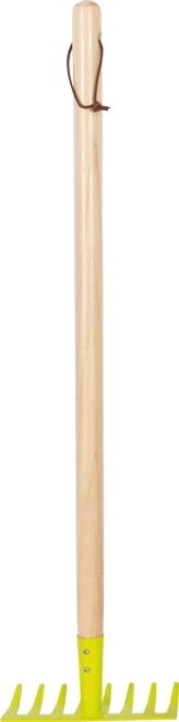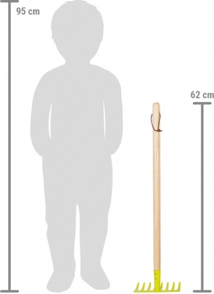 Die Harke hat eine ideale Größe für Kinder, und ihre leichte Ausführung erleichtert die Handhabung. Nach der Arbeit wird sie einfach an der Schlaufe aufgehängt – so ist sie stets griffbereit und ordentlich verstaut.