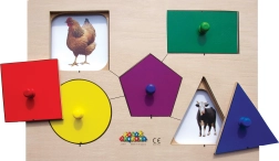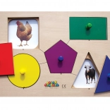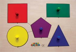 Dieses Holz-Brettpuzzle ist durch seine Lern- und Spielwertigkeit außergewöhnlich. Es enthält 5 geometrische Öffnungen für farbige Teile, die Griffe für komfortables Halten haben.