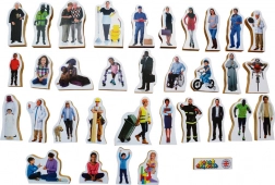 Dieses Set mit 33 realistisch dargestellten, frei stehenden Figuren repräsentiert ein Spektrum verschiedener Altersgruppen, Geschlechter, Berufe und Nationalitäten. Die Figuren haben eine Höhe zwischen 7,5 cm und 10,5 cm und sind aus MDF-Platte mit einer Dicke von 1,5 cm gefertigt.