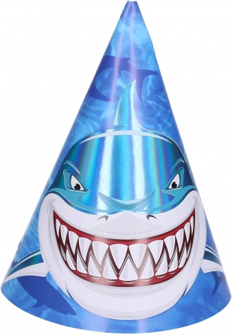 Partyhütchen mit Hai-Motiv, 15 cm, Packung mit 6 Stück. Stilvolle Dekoration für Kinder- und Motto-Partys. Einfach aufzusetzen und sorgt für eine großartige Hai-Atmosphäre.