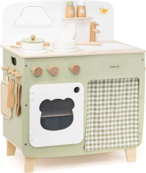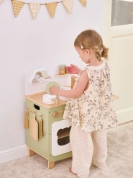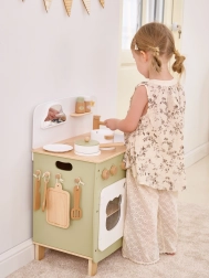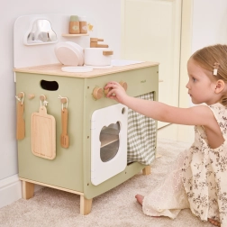 Die stilvolle Kinderküche in angenehmen Natur- und Grüntönen bietet Kindern ein realistisches Kocherlebnis. Dank der robusten Holzkonstruktion, drehbaren Knöpfe, Spüle und Backofen genießen kleine Köche stundenlang sicheres und kreatives Spiel. Die praktische klappbare Seitenablage vergrößert die Arbeitsfläche zum Schneiden oder Essen, während der Schrank mit Vorhang alle Schätze verstaut.