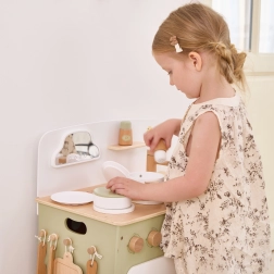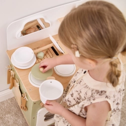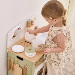 Im Lieferumfang enthalten sind Topf, Pfanne, Teller, Gewürzbehälter, Haken für Utensilien und ein Regal für Gewürze. Die Küche fördert Verantwortung und Selbstständigkeit – nach dem Spielen räumen Kinder ihr Geschirr leicht an seinen Platz. Dank der durchdachten Konstruktion ist sie leicht aufzubauen und vollkommen sicher für Kinder ab 3 Jahren.