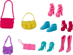 Das Set enthält eine Kollektion von Mode-Accessoires, darunter Schuhe und Handtaschen in lebendigen Farben wie Rosa, Gelb, Türkis und Lila.