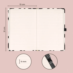 Im Notizbuch finden Sie 172 Seiten auf angenehm gelbem Papier – ideal für das tägliche Schreiben, Planen und kreative Ideen. Die kompakten Maße 13 × 21 cm passen bequem in Tasche oder Rucksack und die Innentasche schützt lose Notizen, Visitenkarten oder Sticker.
