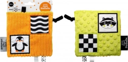 Das beidseitige Design bietet zwei attraktive Illustrationen – Pinguin und Waschbär – sowie viele Details zum Entdecken: Bänder, Plüschschlaufen und ein größeres Etikett zum leichteren Greifen. Diese Elemente unterstützen die Hand-Auge-Koordination und das Üben der Feinmotorik.