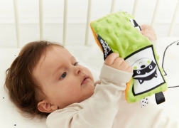 Knistermaterial sowie zahlreiche Bänder, Schlaufen und Etiketten fördern das Hören, die Hand-Auge-Koordination und die Feinmotorik beim Spielen im Bettchen oder Kinderwagen.