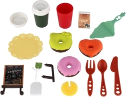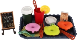 Tablett, Tassen/Becher, Kännchen, Besteck, Lebensmittel-Attrappen (Donut, Keks u. a.)
