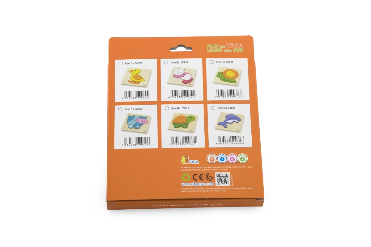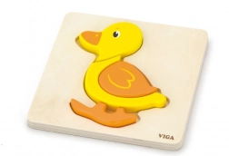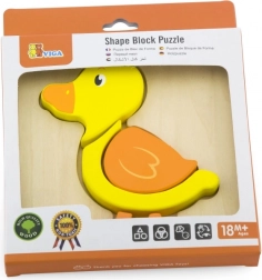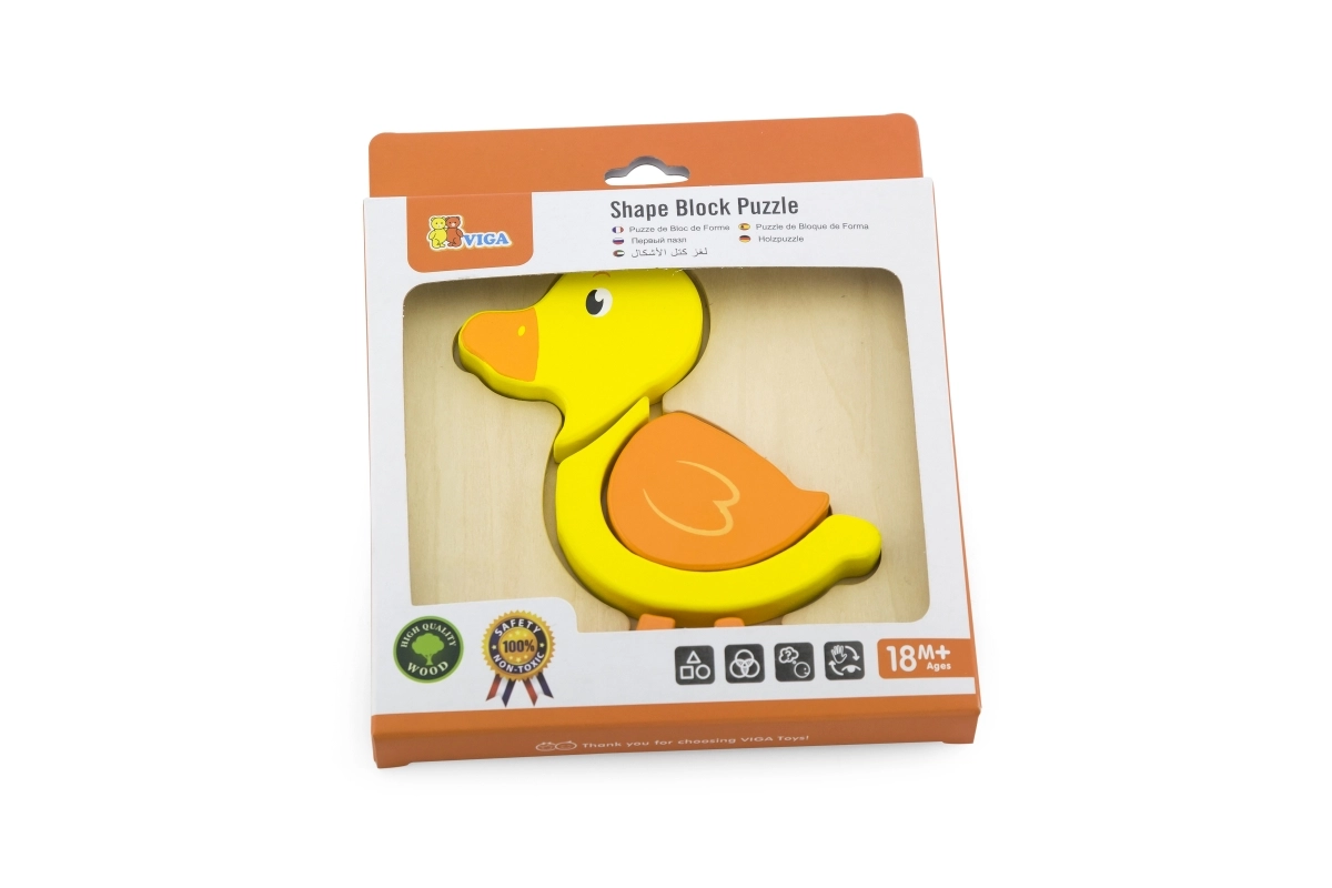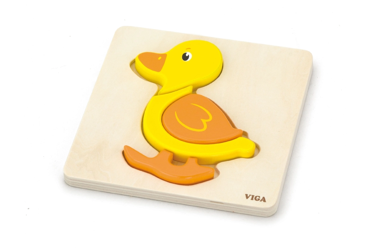 Holzpuzzle – Steckpuzzle für die Kleinsten mit Entchenmotiv. Maße des Entchens ca. 13 × 11 cm. Verpackungsmaße ca. 15,5 × 18 × 2 cm. Alter 18 Monate+