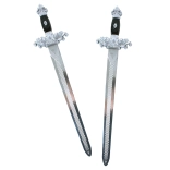 Zum Set gehören zwei identische silberne Schwerter mit einer Länge von 49 cm und dekorierten Griffen – ideal für Duelle oder Spiele zu zweit.