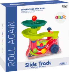 Die interaktive Fontäne mit Rutsche verfügt über einen großen Knopf, der bei Betätigung den gesamten Mechanismus aktiviert. Die Fontäne schleudert fünf bunte Bälle in die Luft und schafft so ein beeindruckendes Schauspiel, das die Aufmerksamkeit des Kindes auf sich zieht.