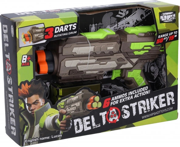 Schaumstoffpistole mit 6 Darts, Reichweite bis zu 15 m. Manuelles Laden per Spannmechanismus, Lauf für 3 Darts, Maße 21 × 13,5 × 5,5 cm. Spaß für drinnen und draußen.