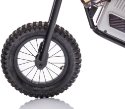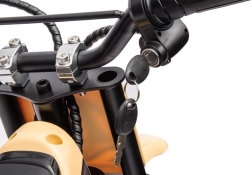Für Sicherheit sorgen Scheibenbremsen, federnde Dämpfer und massive Offroad-Reifen mit hervorragender Traktion. Das Bike wird per Schlüssel gestartet, die Bedienung ist kinderfreundlich – Gas am Griff, wirkungsvolle Bremsen und klare Lenkreaktion. Ideal für die ersten Erfahrungen im Gelände.