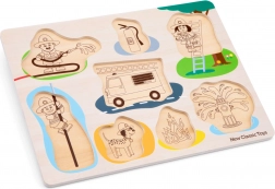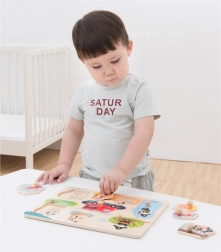 Das Puzzle enthält acht Teile, von denen jedes seine eigene Aussparung und einen Griff zum einfachen Greifen hat. Unter jedem Teil befindet sich ein Bild, das den Kindern hilft, den richtigen Platz zu finden.