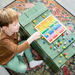 Diese hölzerne Einmaleinstafel ist ein großartiges Hilfsmittel zur Entwicklung des logischen Denkens und der Feinmotorik. Farbige Würfel mit Aufgaben motivieren Kinder, spielerisch zu entdecken und zu lernen; die sofortige Ergebniskontrolle fördert Selbstständigkeit und Selbstvertrauen.