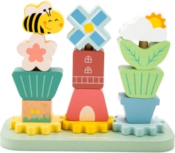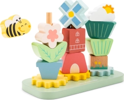 Das Holzstapelspiel Mühlengarten ist ideal für Kinder ab 12 Monaten. Es enthält bunte Holzstücke aus Buchenholz, die Kinder leicht zusammensetzen können. Kreativen Spaß bieten Elemente wie Blumen, Bäume, Windmühlen und Bienen, die auf der Basisplatte mit Stäben gestapelt werden können.