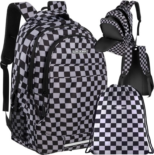 Sie suchen einen universellen Schul- oder Stadtrucksack, der robust, bequem und zugleich ein Hingucker ist? Dieser schwarz‑weiße Schachbrett-Rucksack von KRUZZEL kombiniert strapazierfähiges Oxford 600D mit atmungsaktivem Rückenpanel und EPE-Polsterung für höheren Tragekomfort und Schutz des Inhalts. Zwei seitliche Netztaschen fassen Trinkflaschen, während die Fronttasche und ein reflektierender Streifen die Praktikabilität und Sicherheit in der Dämmerung erhöhen.