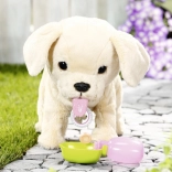Beim Trinken aus dem Näpfchen senkt der Hund den Kopf, streckt die Zunge heraus und man hört Schlürfen. Nach dem Trinken hebt er das Bein und macht Pipi – eine realistische Funktion, die Kinder begeistert und ihre Fantasie beim Rollenspiel rund um die Tierpflege anregt. Der Knochen löst Knuspergeräusche aus, Streicheln über den Rücken sorgt für Schwanzwedeln und fröhliches Bellen.