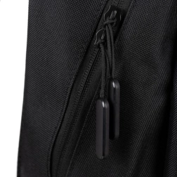 Hauptfach mit zwei Schiebern, gepolstertes Laptopfach, Fronttasche, seitliche Netze für die Flasche und ein reflektierender Streifen für bessere Sichtbarkeit.