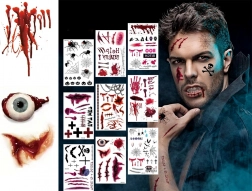 Erzeuge in Sekunden einen schaurigen Look mit dem vielseitigen Set für Halloween-Temporary-Tattoos. Realistische blutige Effekte, Spinnen und Spinnennetze sowie Narben und Schnittwunden verleihen deinem Kostüm einen dramatischen Auftritt. Die Tattoos sind leicht aufzubringen, hautfreundlich, langanhaltend und mit Wasser oder Make-up-Entferner abwaschbar.