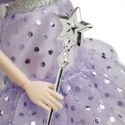 Violette Rüschenkleider, ein Perlengürtel und glitzernde Details verleihen der Puppe einen märchenhaften Look, der bei jeder Präsentation glänzt.