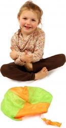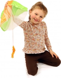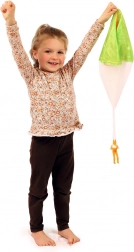 Der leichte Stofffallschirm entfaltet sich im Flug und stabilisiert den Fall der Figur – sicheres und beeindruckendes Gleiten für Kinder ab 3 Jahren.
