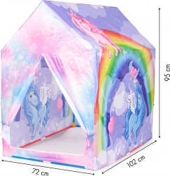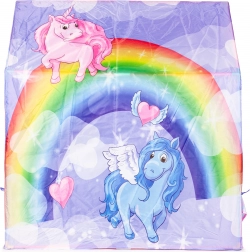 Das farbenfrohe Kinderspielzelt in Hausform bietet einen magischen Spielraum für drinnen und draußen. Die leichte Konstruktion ermöglicht schnellen Aufbau und einfaches Tragen, Rolltüren unterstützen sicheres und kreatives Spielen. Fröhliche Einhorn- und Regenbogenmotive begeistern jedes Kind.