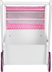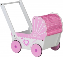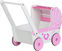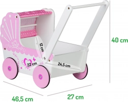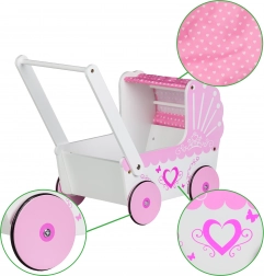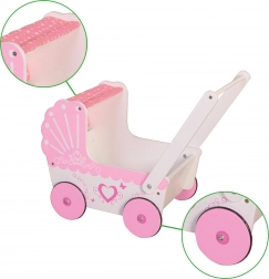 AUSFÜHRUNG: Der Wagen ist aus Holz gefertigt und in einer angenehmen Farbkombination gehalten. Auf der weißen Ausführung befinden sich rosa Herzchen. Rosa sind auch die Räder, das Verdeck und die innere Polsterung.