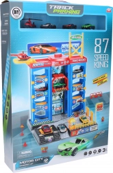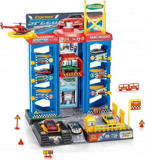 Tolle Parkstation für kleine Fahrer bietet 3 Metallautos und einen Metallhubschrauber mit Helipad. Es gibt einen manuellen Aufzug, eine Tankstelle und eine Schranke. Mit einem einfachen Hebelzug löst du das Auto aus dem Parkplatz. Die Abmessungen der Station sind 30 × 27 × 37 cm, die Autos sind 7 cm groß.