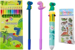 Das Set enthält außerdem zwei Stifte mit Dinosauriermotiven, die sicher zu den Favoriten jedes kleinen Fans dieser faszinierenden Wesen werden. Teil des Mäppchens sind auch ein Spitzer, eine Stiftkappe in Dinosaurierform und bunte Aufkleber mit Dinosauriermotiven, mit denen Hefte, Bücher oder das Mäppchen selbst dekoriert werden können – so wird es noch einzigartiger.