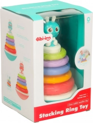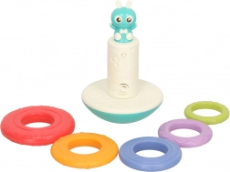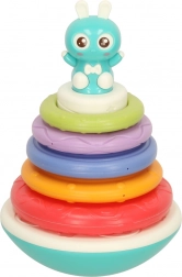 Dieser bunte Turm begeistert jedes Kind! Er besteht aus einer schaukelnden Basis mit einem kleinen Freund – einem Häschen – und fünf unterschiedlich großen Ringen. Die Aufgabe des Kindes ist es, sie nacheinander aufzustecken und so einen Regenbogenturm zu bauen. Nach jedem Aufstecken ertönt eine fröhliche Melodie, die das Kind zum weiteren Spielen motiviert.