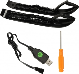 - Komplettset – Schneemobil, Controller, Akku, USB-Kabel, austauschbare Skier und Räder, Schraubendreher.