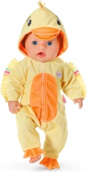 Der weiche Enten-Overall für BABY born Puppen in Größe 43 cm macht aus dem Spiel ein kuscheliges Abenteuer. Die Kapuze mit Schnabel, der kontrastierende orange Bauch und die „Schwimm“-Füßchen sorgen für einen niedlichen Look, während der Frontreißverschluss das Umziehen und das Üben der Feinmotorik erleichtert.