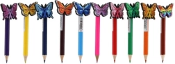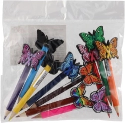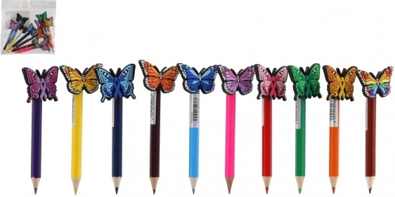 Jeder Buntstift ist mit einem bunten Schmetterling verziert, der den Buntstiften ein fröhliches und funktionales Aussehen verleiht.