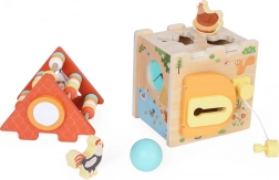 Dieses Spielzeug ist ideal für die Entwicklung von Kindern, da jede Seite des Häuschens ein neues Abenteuer verbirgt. Ob es ums Sortieren, Schieben oder Schlösser geht. Der Würfel enthält auch ein Rechenbrett, das als Dach des Häuschens dient.