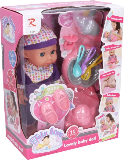 Alles Nötige für ein komplettes Erlebnis ist dabei: Töpfchen, Teller, Besteck, Fläschchen und Schnuller. Die Puppe hat die ideale Größe von 30 cm, liegt gut in der Hand und eignet sich perfekt für den Alltag zu Hause und unterwegs.