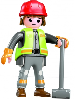 Bauarbeiter-Figur für ein Bauset mit einer Größe von 7 cm ist ideal für alle kleinen Baumeister. Das Paket enthält verschiedene Varianten und Zubehör, wie Werkzeuge und eine Bauanleitung.