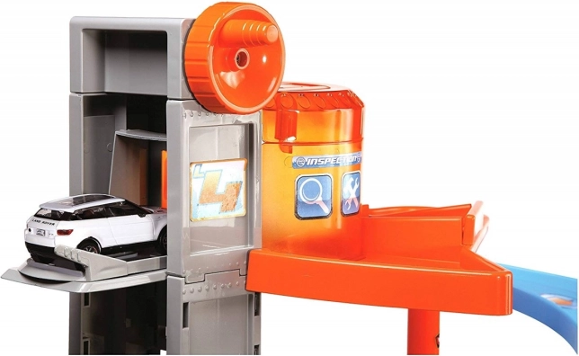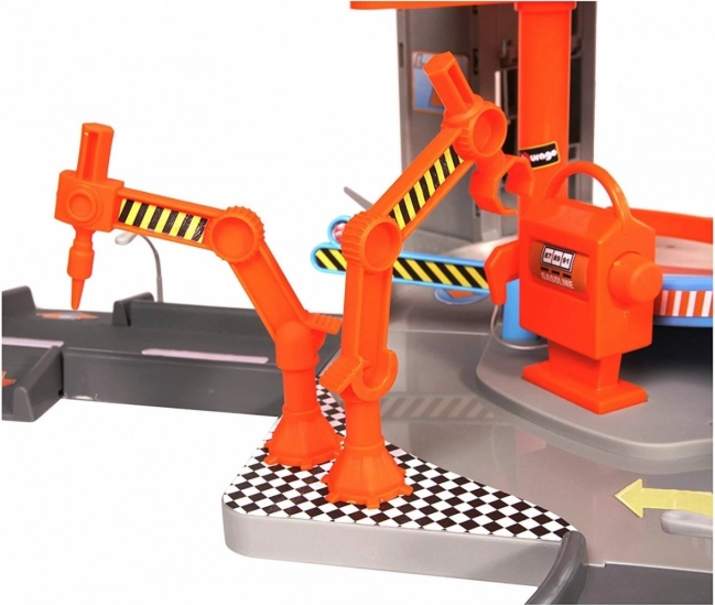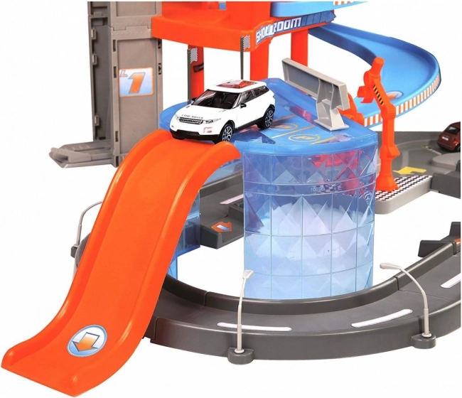 Diese mehrstöckige Bburago-Garage mit Waschanlage verbirgt viele funktionsfähige Elemente! Fahre das Auto mit dem Aufzug bis in das oberste Stockwerk der Garage und lass es die Straße hinunterfahren! Halte in der Werkstatt, wasche das Auto in der Waschanlage und fahre durch die Hebeschranken!