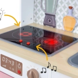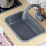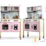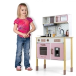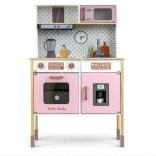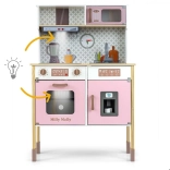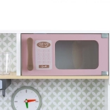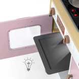 Zur Ausstattung gehören ein Backofen mit Sichtfenster, eine Mikrowelle, ein Kühlschrank mit realistischem Eiswürfelspender und ein einbeckeniges Spülbecken. Auf dem Panel befinden sich eine Dunstabzugshaube mit Licht und Sound, verschiebbare Haken zum Aufhängen von Zubehör sowie eine Uhr mit beweglichen Zeigern zum Erlernen der Uhrzeit. Illustrationen von Küchenelementen an der Wand regen Fantasie und thematisches Spiel an.