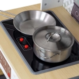 Das Kochfeld mit Kochgeräusch und Beleuchtung, der Backofen mit Licht sowie klickende Regler vermitteln Kindern ein echtes Kocherlebnis.