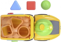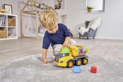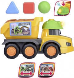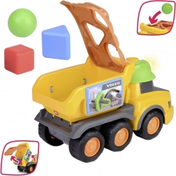 Der gelbe Volvo Spielzeug-LKW mit fröhlichem Design und bunten Bausteinen zum Formensortieren ist ideal zur Förderung der motorischen Fähigkeiten.
