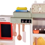 Die interaktive LED-Dunstabzugshaube mit Melodien, der Eikocher mit Licht und Ton sowie die Kreidetafel für das Menü fördern Fantasie und Feinmotorik. Die Küche bietet viel Stauraum – Regale, Schubladen, Haken – und ein umfangreiches Set an Geschirr, Lebensmitteln und Gewürzen für endlose Rollenspielszenarien.