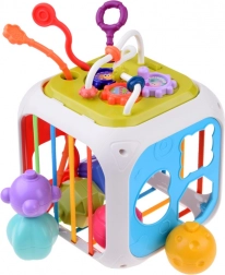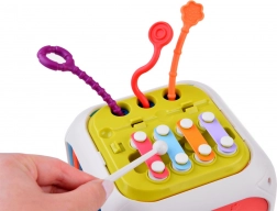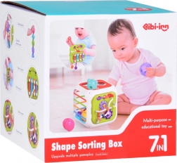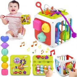 Dieser farbenfrohe Lernwürfel aus hochwertigem Kunststoff bündelt beliebte Aktivitäten kleiner Kinder in einer kompakten Einheit. Zwei Seiten dienen als Formensortierer mit verschiedenen Öffnungen, drei weitere sind mit elastischen Gummibändern zum Durchschieben der Klötzchen und zum Training des Tastsinns ausgestattet. Die beidseitige Panelwand ergänzt auf der einen Seite ein Glockenspiel und Ziehbändchen mit unterschiedlicher Textur und auf der anderen Seite Zahnräder und Schiebesperlen.