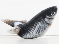 Nach einem leichten Klopfen auf den Bauch erwacht der Fisch zum Leben und beginnt mit dem Schwanz zu wedeln – ganz wie ein echter Fisch.